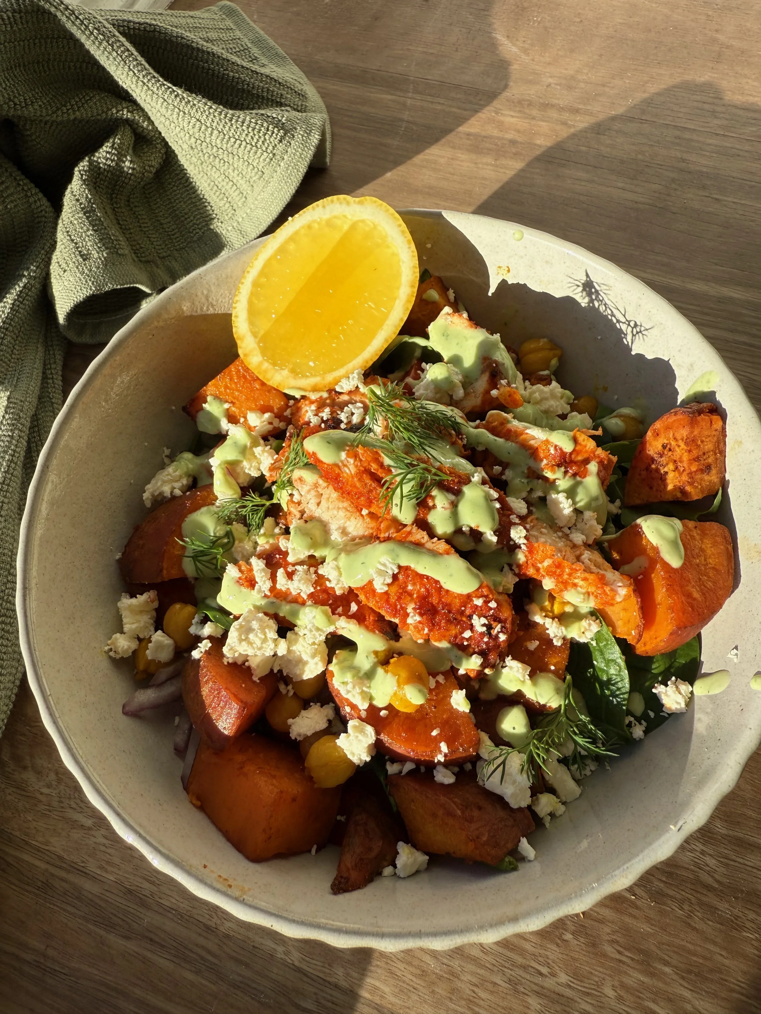 Roughly chop sweet potato, leaving the skin on into small cubed pieces. Season with salt and pepper and a drizzle of extra virgin olive oil. Add to a lined baking tray and bake in the oven for roughly 25-30 minutes (cooking time is based on size of sweet potato pieces).